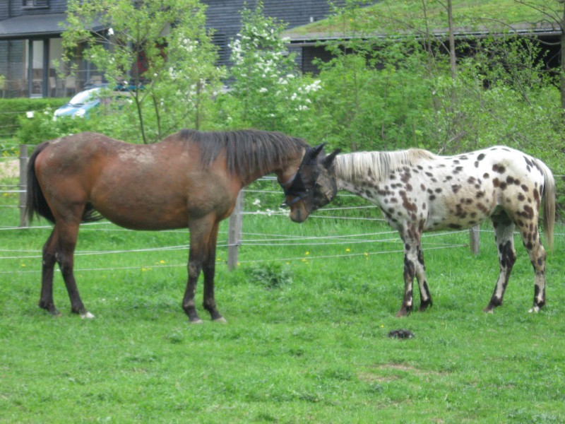 Tak jsem během jara přestěhovala koně. Cholinka bydlí v Hejnicích ještě s dvěma kámošema. Je šéfovou stáda, takže její sebevědomí značně vzrostlo, což je jedině dobře. Doteď byl takovej otloukánek, kterého všichni koně šikanovali a odháněli... Teď si může určovat sama, kde chce být a s kým :) Včera jsem převedla i Buka. Dočasně ho budu mít "doma" tudíž zároveň i v práci... S místníma huculama a Kvídem se nejspíš poznali, takže žádné výpady od nich se nekonaly a seznámení proběhlo bez problému. Max vzal zase Buka pod svá ochranitelská křídla, takže ani není možnost příblížit se jinému koni k Bukovi. Je to dobře, že má vlastního bodyguarda :)